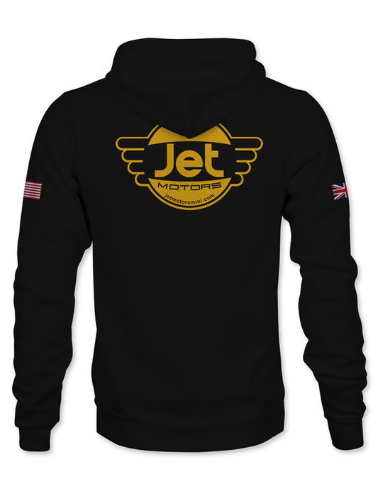 JET Motors Gold JET Logo with Union Jack and American Flags on sleeves.